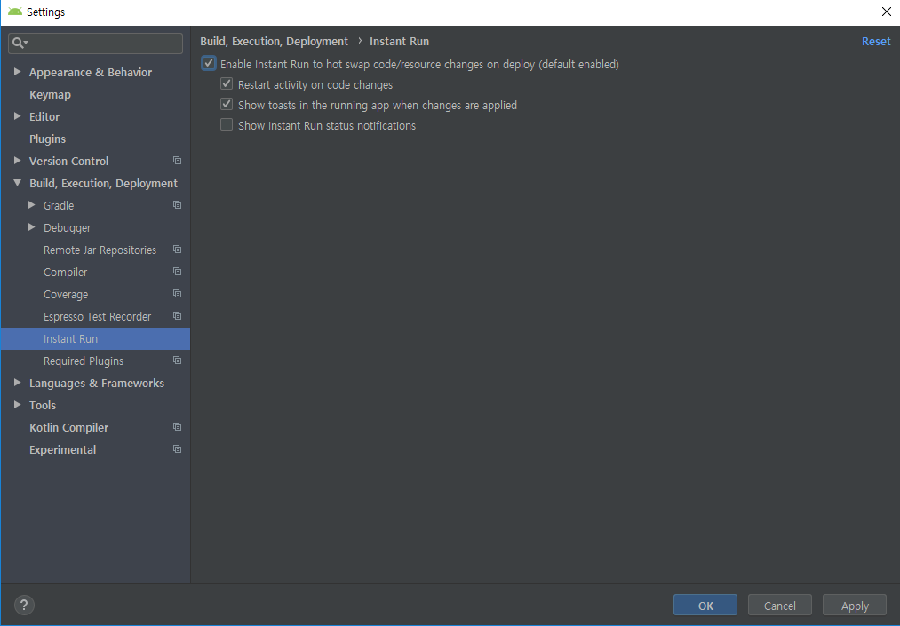 File -> settings -> 카테고리에서 Build, Execution, Deployment 선택 -> Instant Run 선택 -> Enable Instant Run to hot swap ~~~ 체크 해제 -> ok 선택 하고 다시 앱 빌드 실행