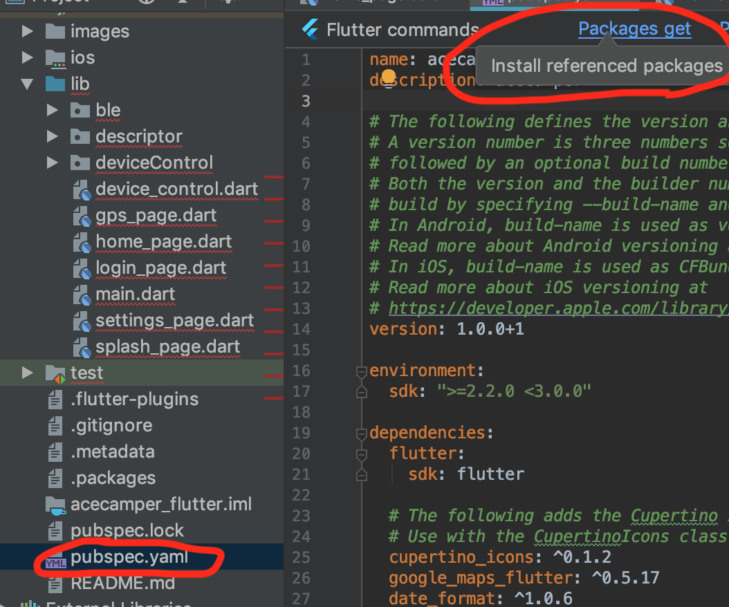 pubspec.yaml 에서 packages get 을 선택해주면 끝! pubspec.yaml 을 선택하고 상단에 나타나는 packages get 을 선택해주시면