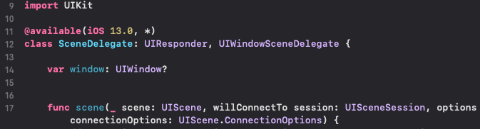 1. SceneDelegate.swift 은 iOS 13 이상의 버전 이므로 이 전체 클래스에 available 속성을 추가해야합니다.