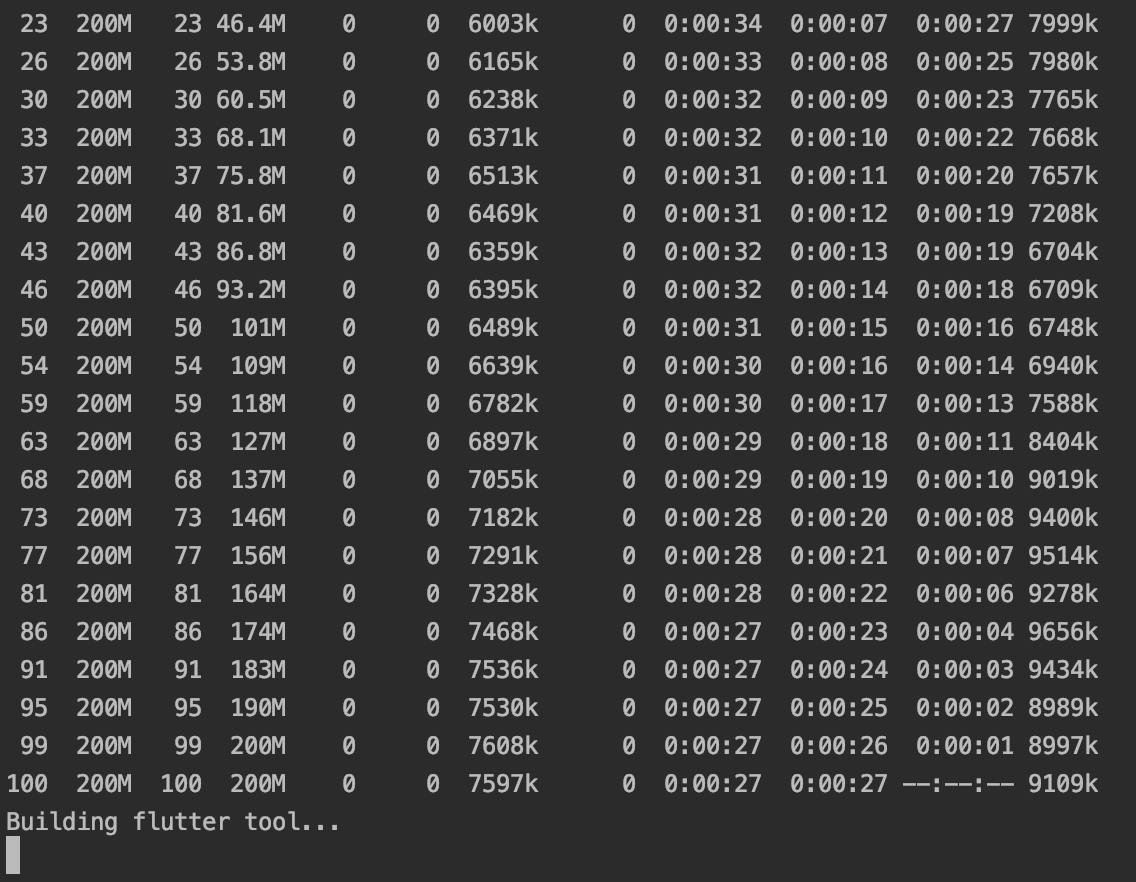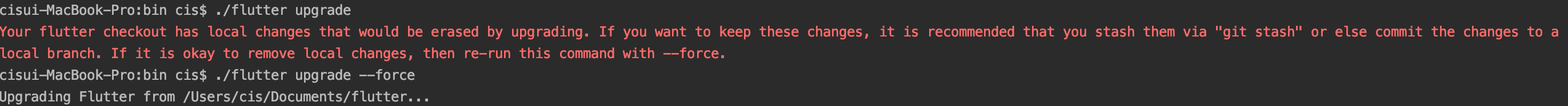 해당 위치에서 flutter upgrade --force 를 입력해주면 업그레이드 작업이 진행되며 아래와 같이 진행됩니다.