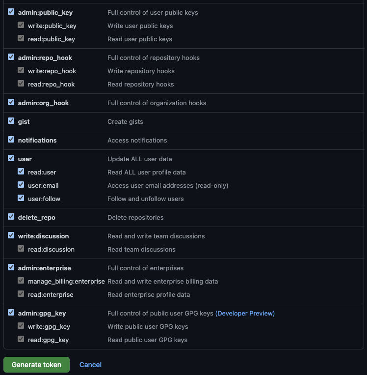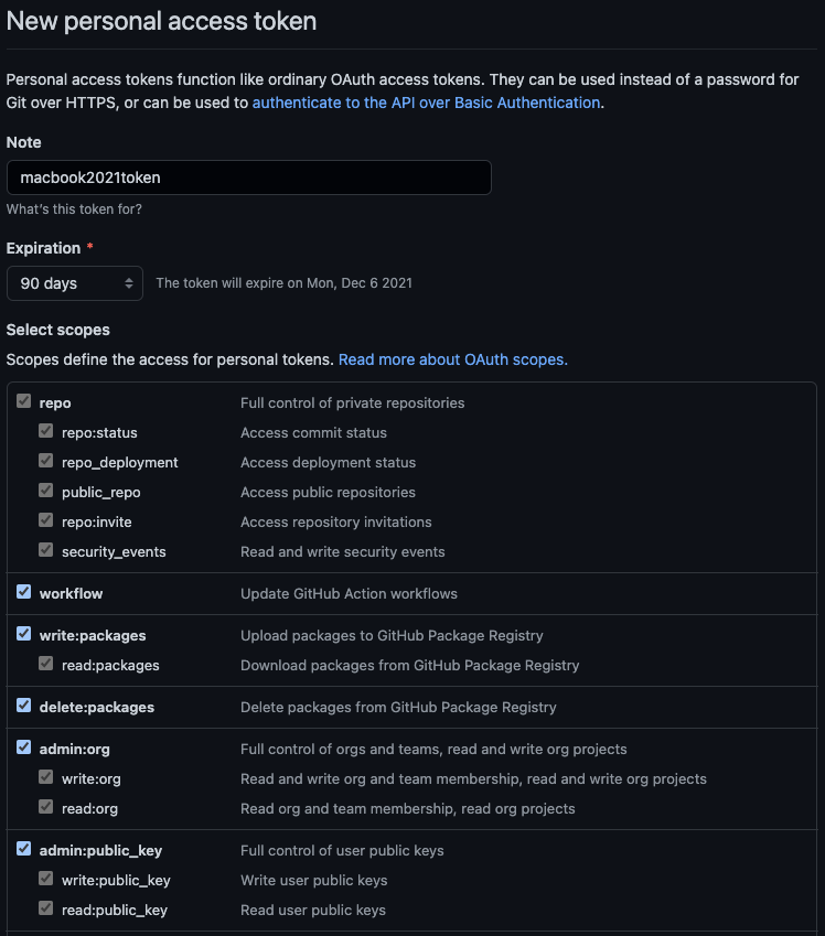 4. note, expiration, select scopes 를 선택, 입력해줍니다. 다 입력 하면 하단에 Generate token 을 선택합니다.