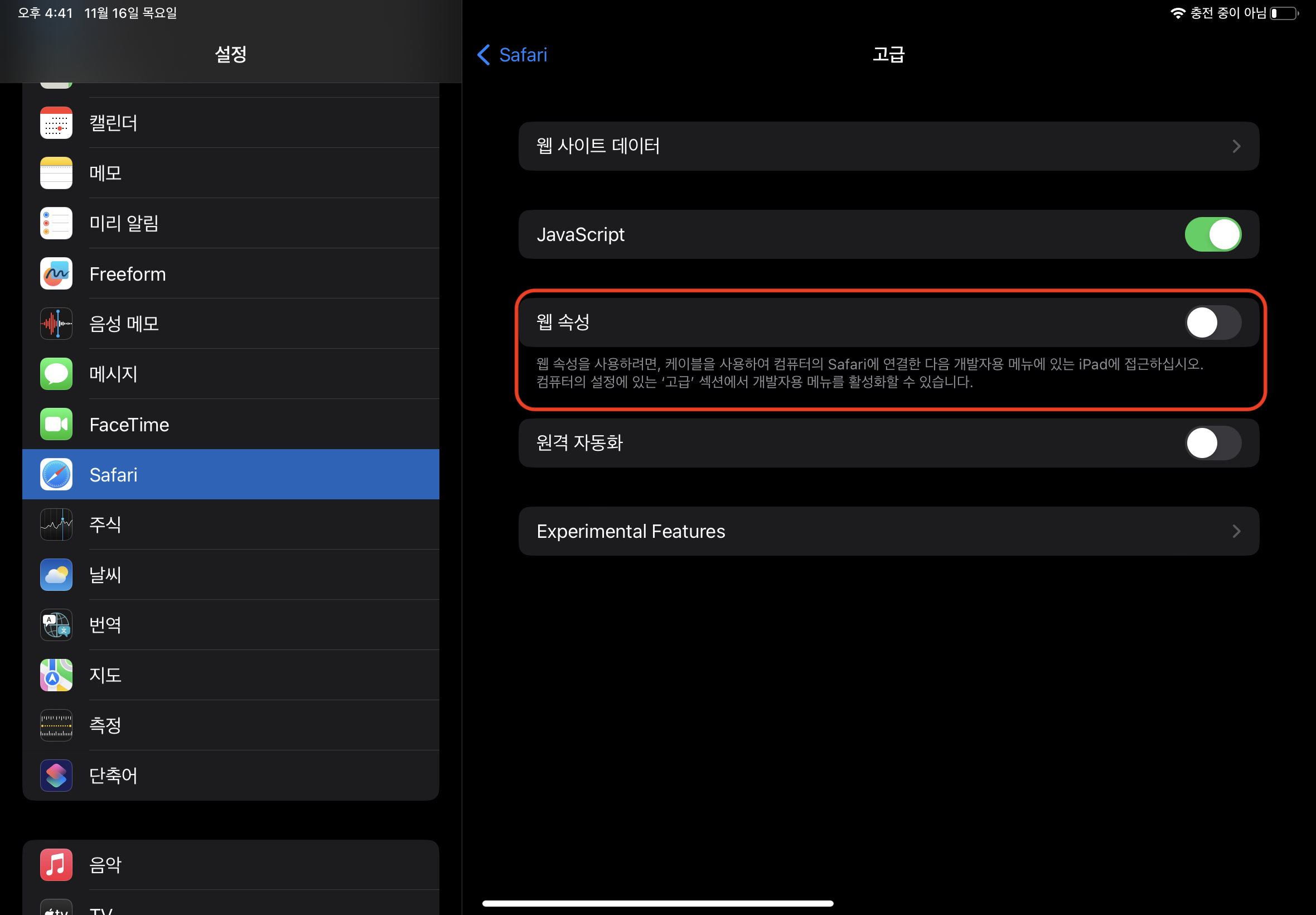 ※ 만약 4번 내용처럼 사파리 항목이 보이지 않고 기기에서 웹 속성 활성화 가 나타난다면 아이폰 또는 아이패드에서 사파리 설정을 변경해줘야 합니다.