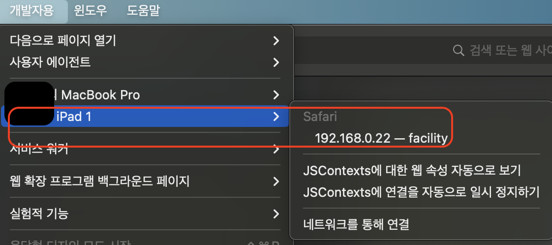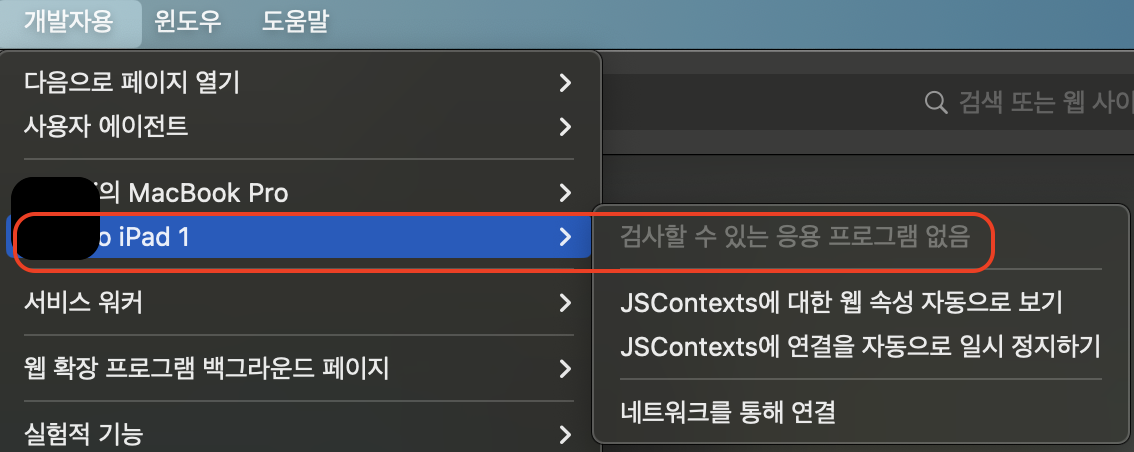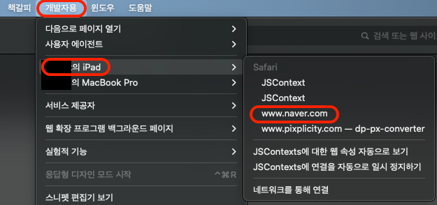 (4) 아이폰 또는 아이패드에서 설정이 완료 되면 맥북의 사파리 개발자용 탭에서 아래 스크린샷과 같이 변경 되는걸 확인할 수 있습니다.
