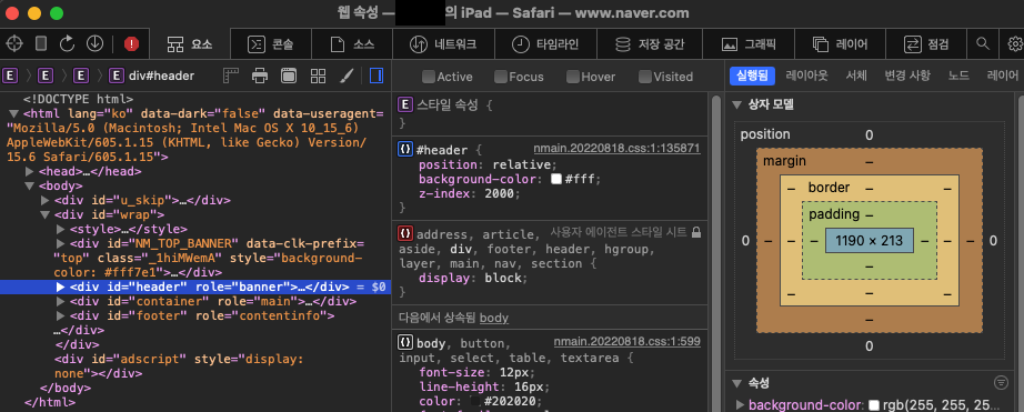 아이패드에서 사파리를 실행 시킨 상태에서 맥북 사파리 상단의 탭에 개발자용 > ㅇㅇ의 iPad > 디버깅할 사이트 를 클릭