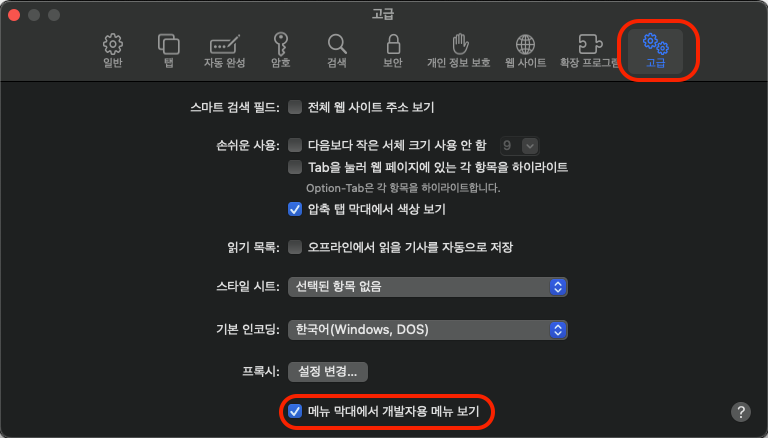 3. 고급 탭 > 메뉴 막대에서 개발자용 메뉴 보기 클릭