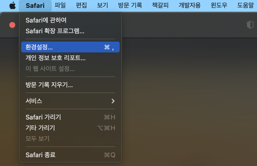 2. 사파리를 선택한 상태로 상단의 safari > 환경설정 클릭