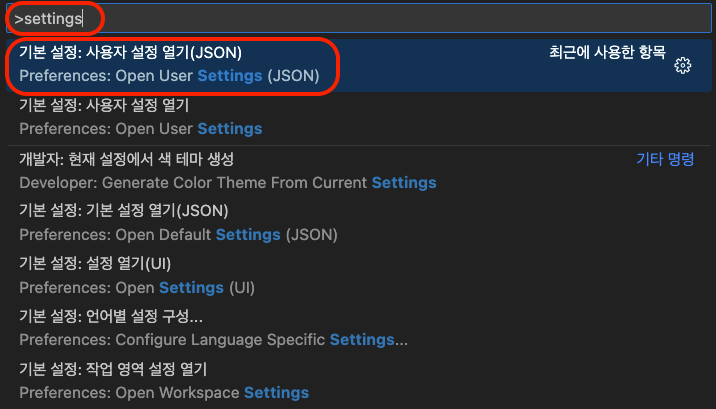 2)입력란에 settings 를 넣으면 관련 내용들이 나오는데 그중에 Open User Settings(JSON) 이라고 되어있는걸 선택해줍니다.