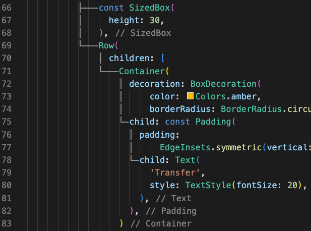 "dart.previewFlutterUiGuides": true저장 한 후 vscode 를 재시작 하면 아래처럼 트리 구조로 보이게 됩니다.