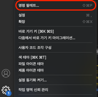 1) vscode 좌측 하단에 보면 톱니바퀴 아이콘을 선택해서 명령 팔레트를 클릭해줍니다.