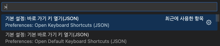Open Keyboard shortcut 와 Open Default Keyboard shortcut 이 검색 되는데 첫 번째 항목인 Open Keyboard shortcut 를 선택해줍니다.
