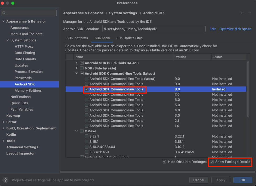 3. Android SDK Command-line Tools(latest) 로 체크 되어있는 항목을 선택 해제 한 후 Android SDK Command-line Tools 8.0 버전을 선택해서 Apply -> OK 해줍니다.