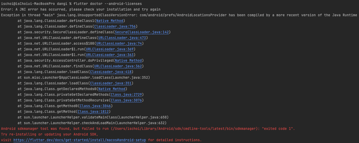 그래서 flutter doctor --android-licenses 를 입력했더니 아래와 같은 에러가 나타나네요.