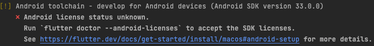 flutter doctor 를 이용해서 이상 내용이 있는지 확인해봤는데 license 부분이 문제가 있다고 나왔습니다.