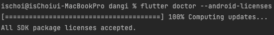 4. 제거 및 설치 완료 되면 다시 flutter doctor --android-licenses 를 입력합니다.