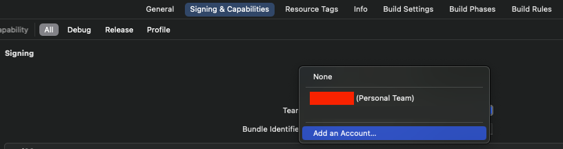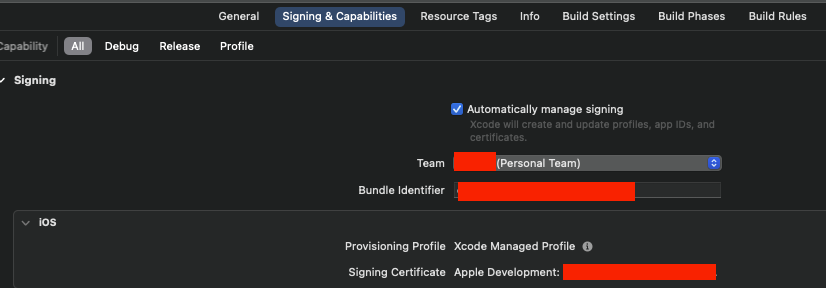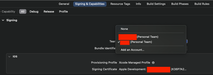 Siginig Certificate Apple Development 오른쪽에 빨간색 글자가 나타날 수도 있는데 일단은 내버려 두고 실제 단말기와 연결