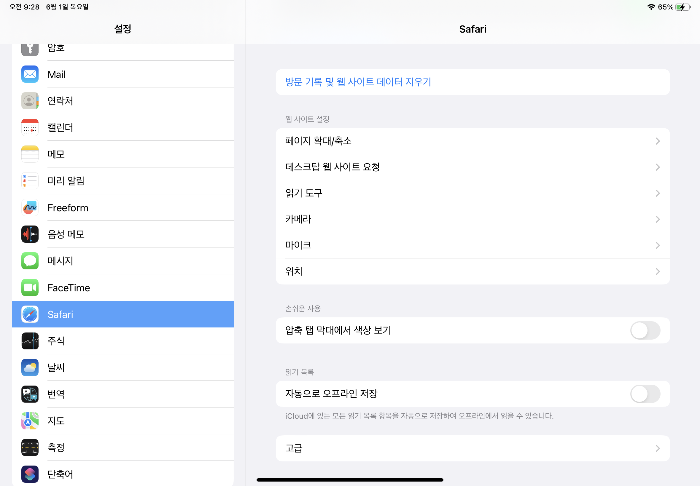 1) 설정 > Safari 선택 > 고급 선택