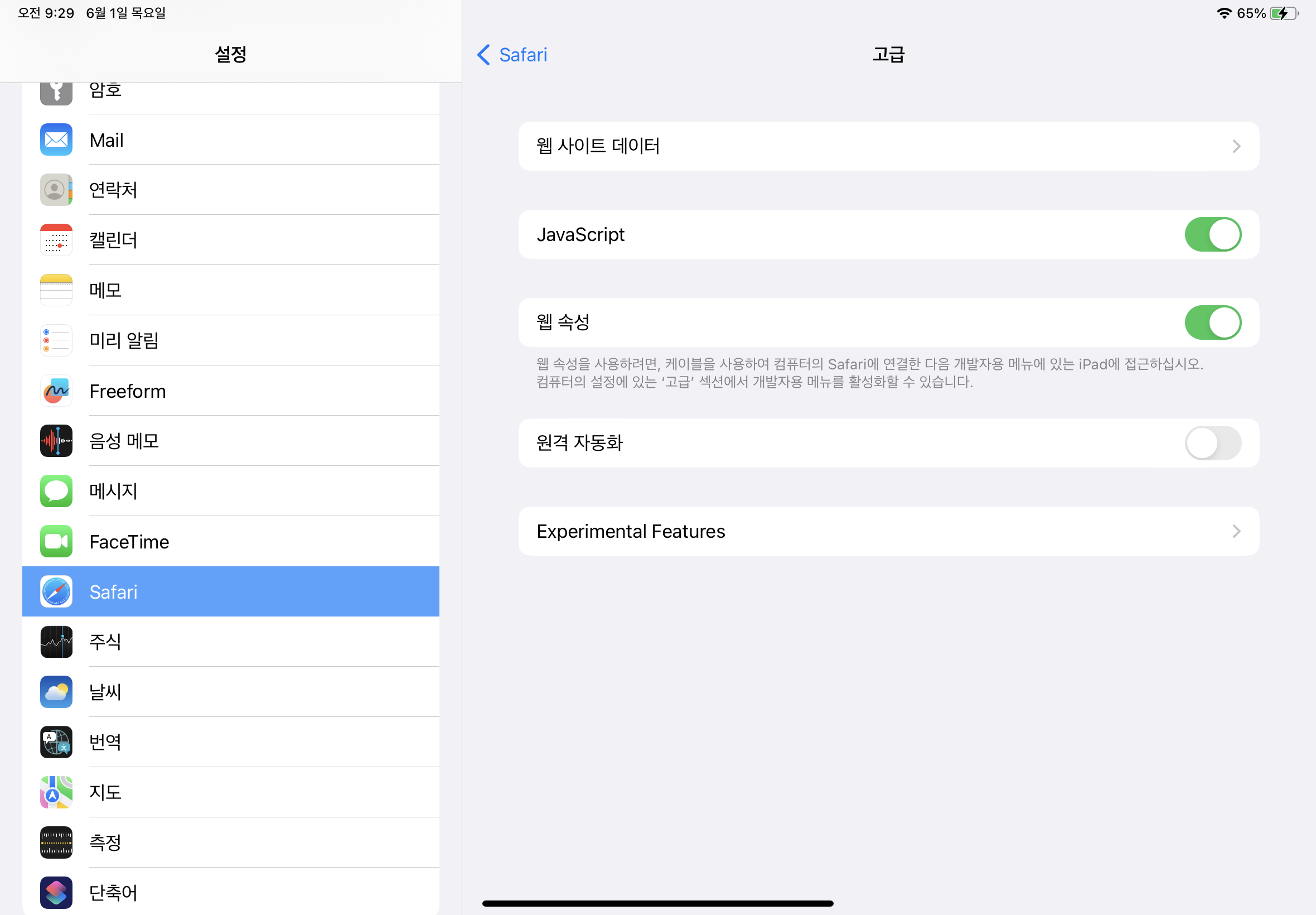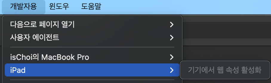 이번에 테스트용 아이패드 에어5세대를 구매하면서 웹 내용을 디버깅할 일이 생겨서 확인해보려고 맥북에서 safari 실행 후 safari 메뉴 항목 중 개발자용 을 선택해서 ipad 를 눌렀는데 기기에서 웹 속성 활성화 라는 항목만 보였습니다.