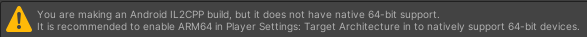 - 현재 Android IL2CPP 빌드 설정이 64비트 지원을 포함하지 않습니다.