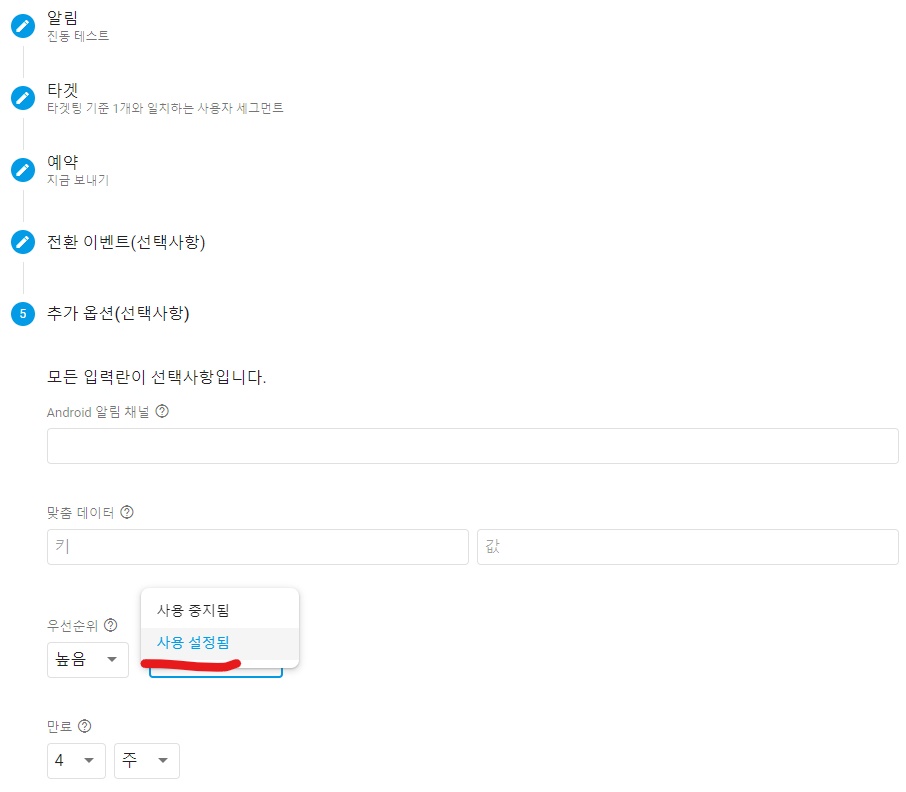 이렇게 추가 옵션 부분에서 알림음 부분을 클릭해서 사용 설정됨으로 변경한 후에 보내주었더니